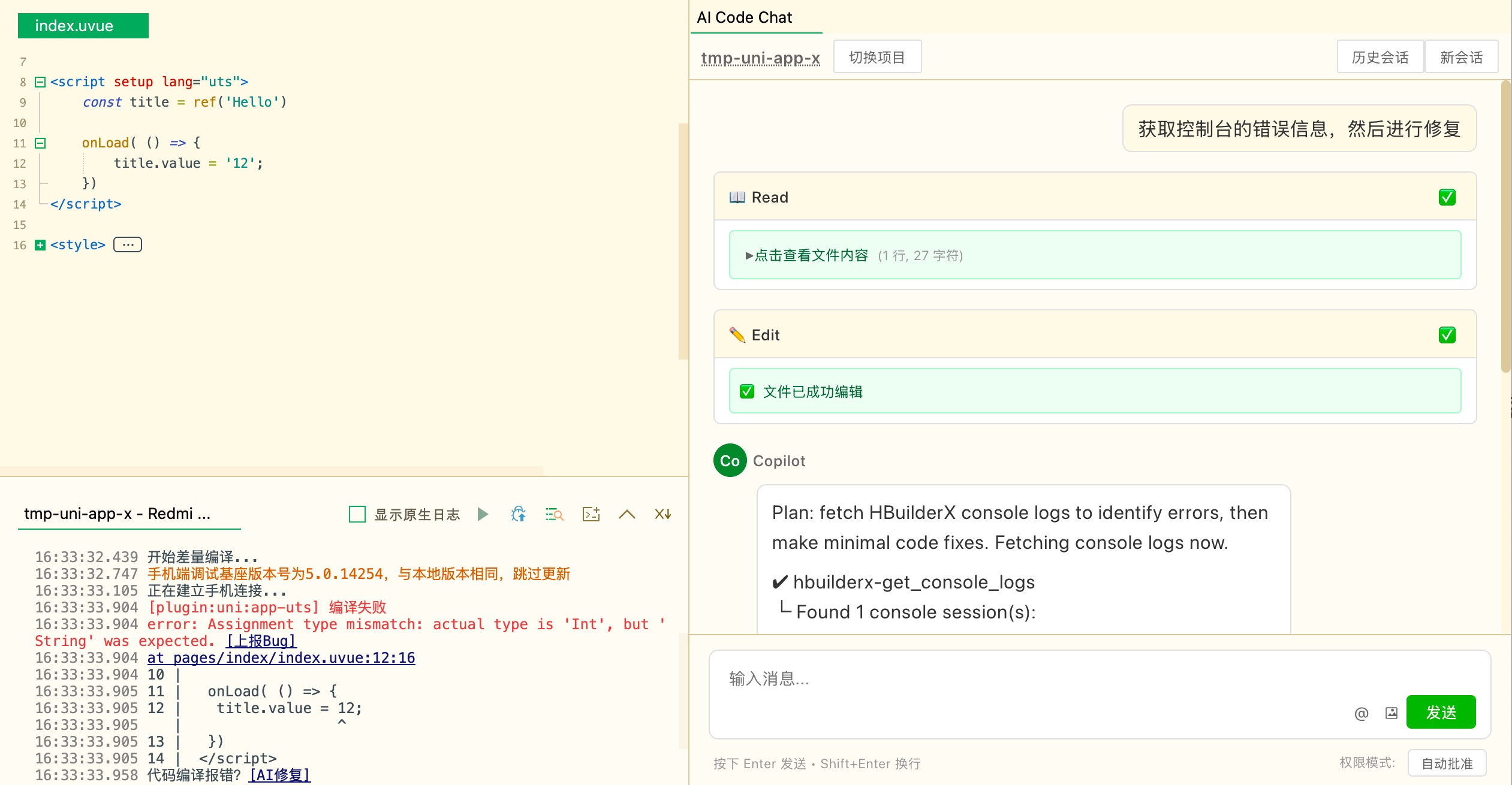 如下图所示:当你运行uni-app的时候,控制台出现错误信息,您可以告诉AI