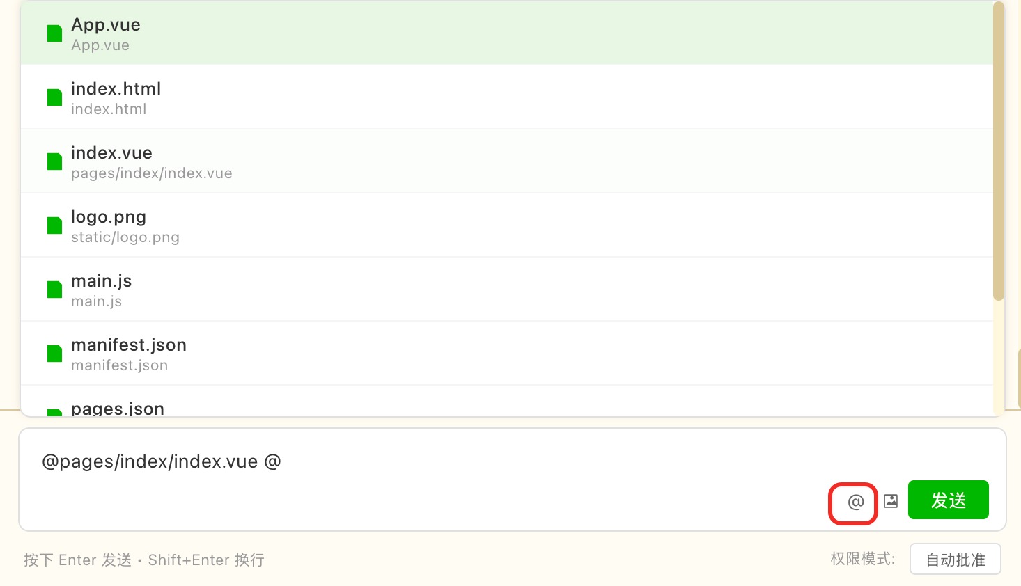 @符号,会自动打开文件选择窗口。@图标,也会自动打开文件选择窗口