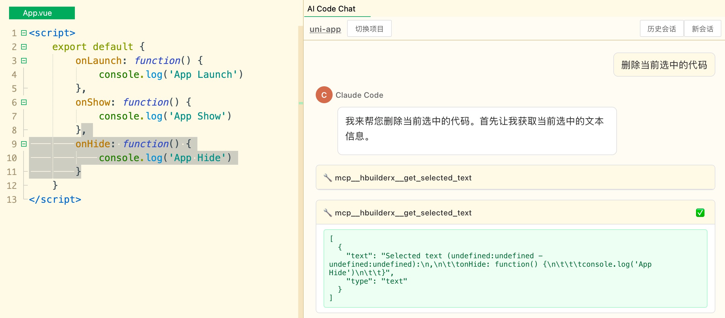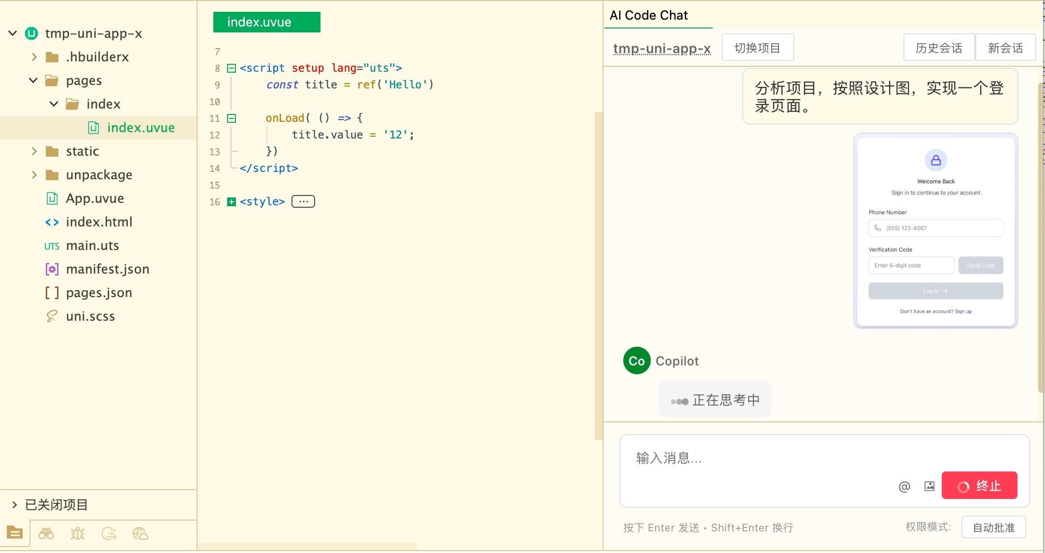 从HBuilderX 5.01起,专为uni-app (x)开发优化的agent上线,并内置了顶尖的AI Coding模型,称之为uni-agent。