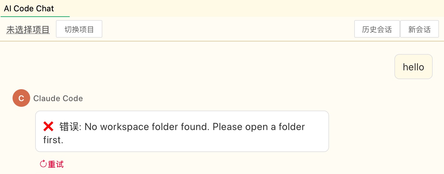 如上,提示错误:错误: No workspace folder found. Please open a folder first. 因为:开启聊天,必须选择一个项目。