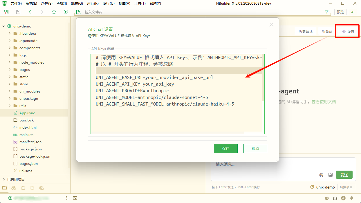 点击聊天视图右上角【设置】进入配置面板后,按 KEY=VALUE 的格式逐行填写(以 # 开头的行会被忽略)。点击【保存】后,这些配置会写入插件的全局存储,并在下次初始化 uni-agent 时自动注入到进程环境变量中;如果你同时使用了 DCloud 账户订阅与手动配置了环境变量,则会优先使用手动配置而不再请求订阅信息。