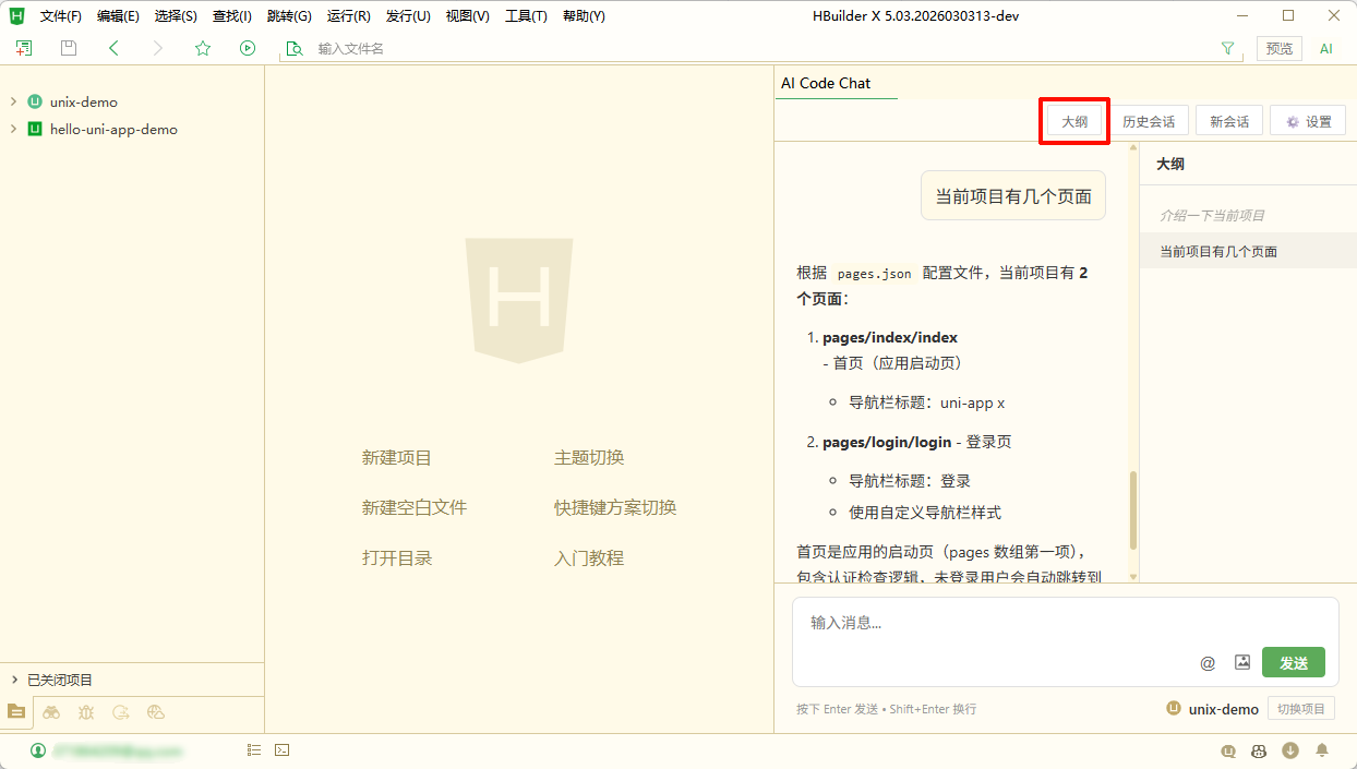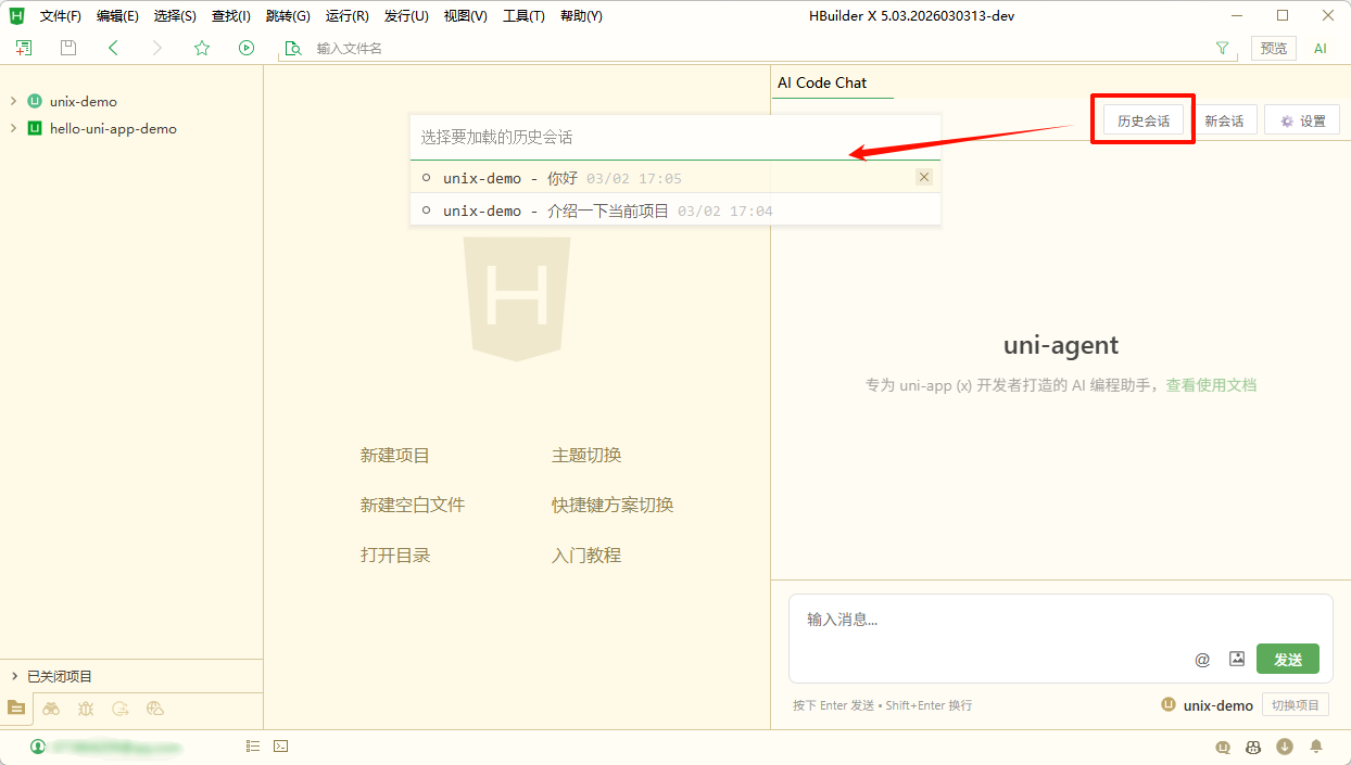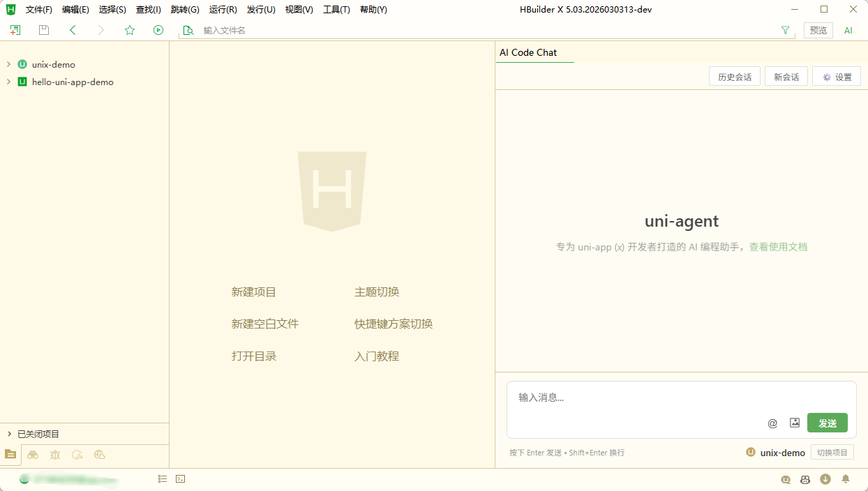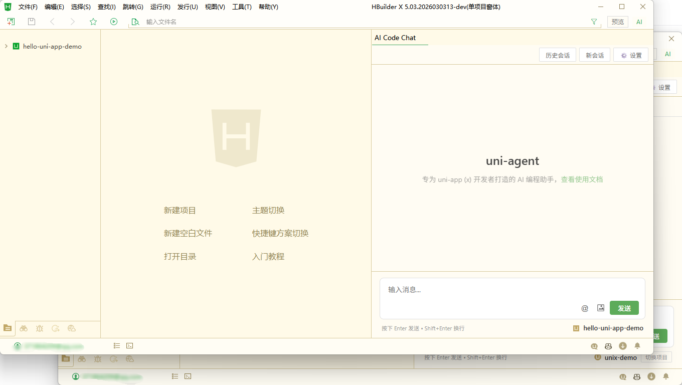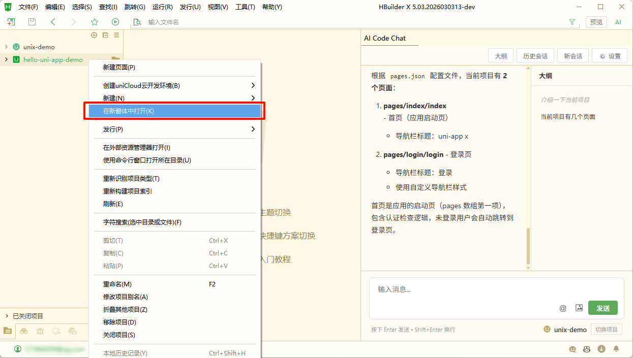 如下图,HBuilderX 同时导入了 unix-demo 和 hello-uni-app-demo 两个项目,我想让 uni-agent 同时处理这个两个项目的任务,那么我就可以将 hello-uni-app-demo 项目在新窗体中打开,然后再打开 uni-agent 聊天视图,这样新窗体的 uni-agent 就会基于当前所选的项目上下文进行对话和操作。