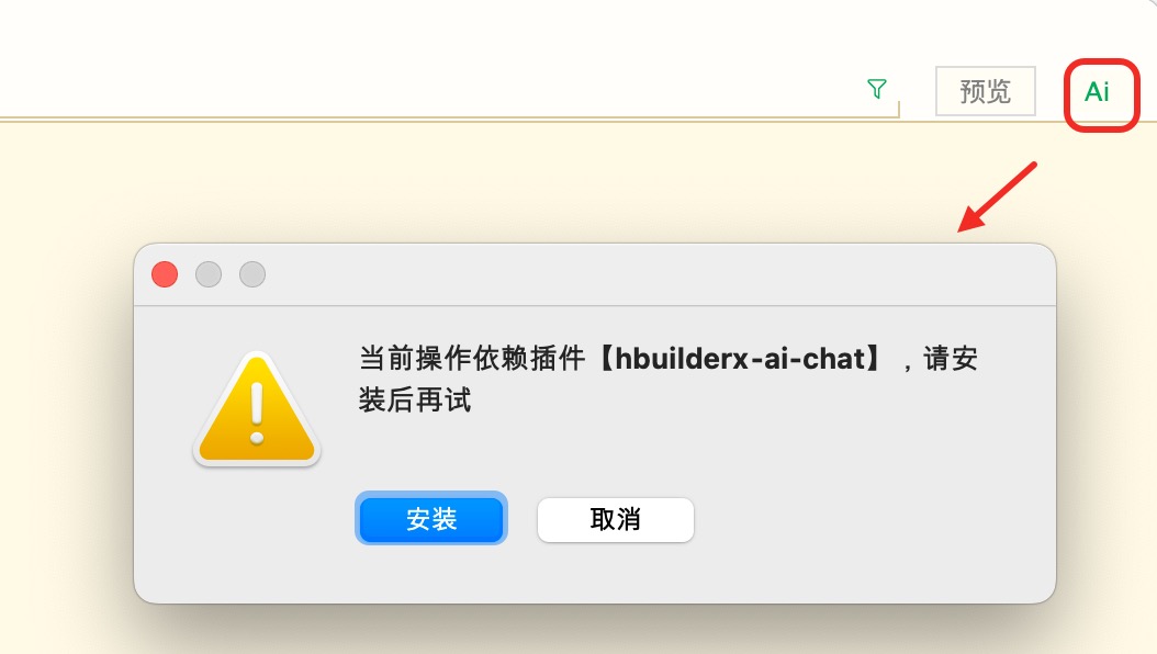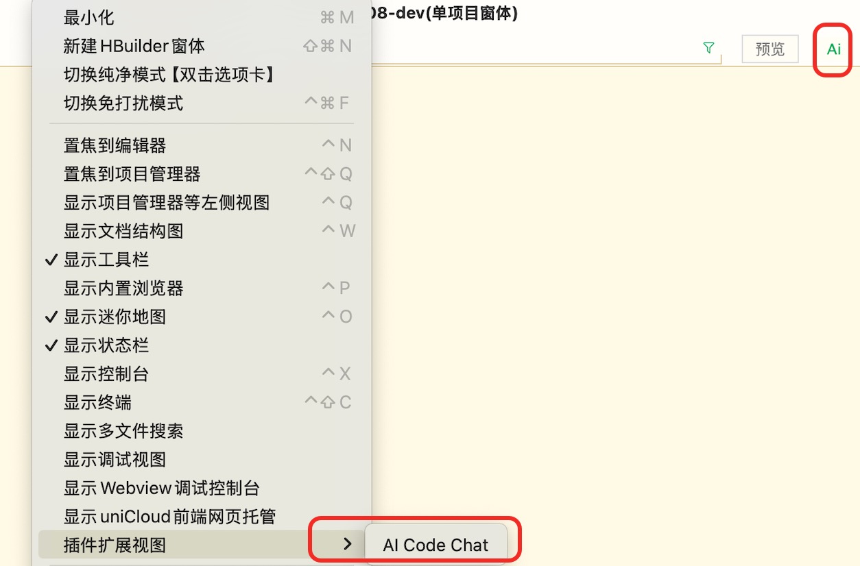 如下图所示,工具栏,点击最右侧的 AI 图标,即可安装 uni-agent 插件。