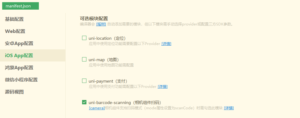 可视化界面操作在 “iOS App配置” 的 “可选模块配置” 勾选 “uni-barcode-scanning(相机组件扫码)”模块:
