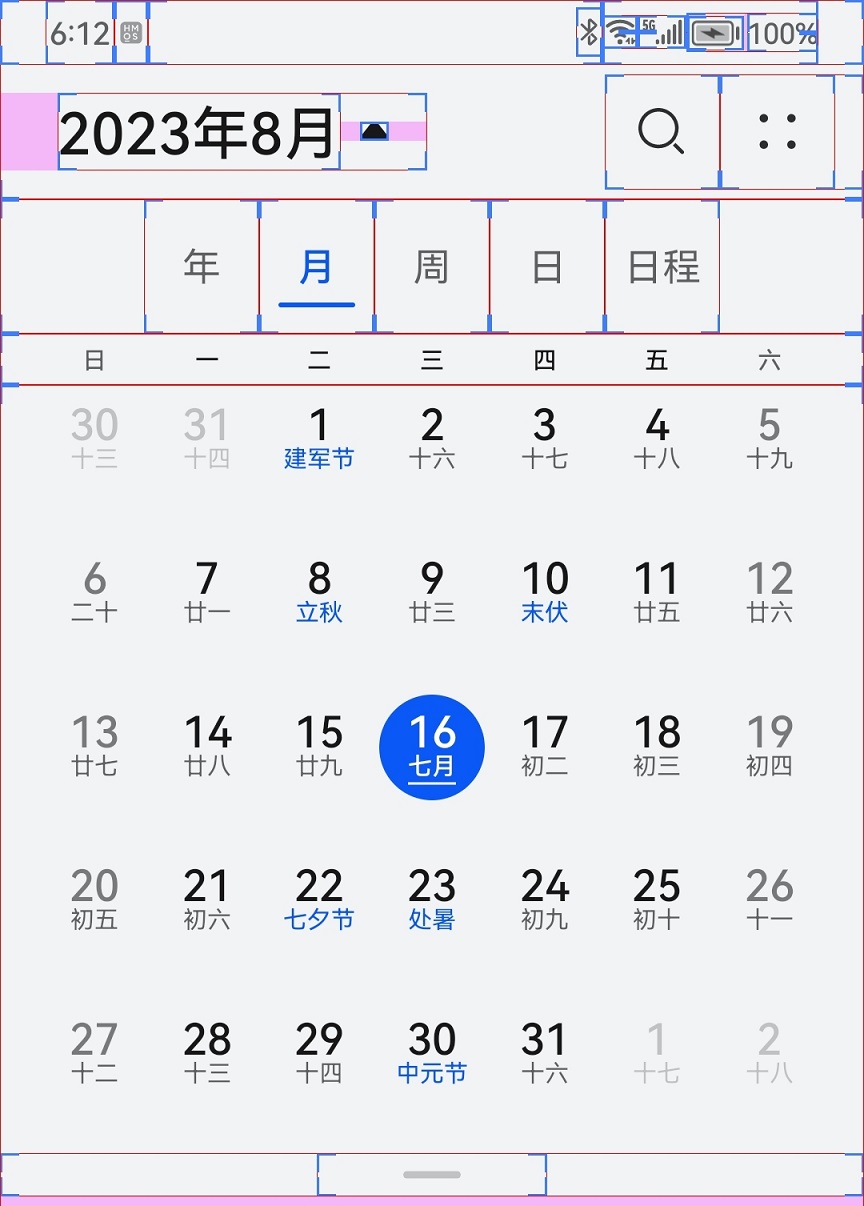 那么原生Android开发怎么做的呢?使用Android的开发者模式审查元素边界,可以发现rom自带的日历,并不是每个格子一个view,而是整个月都是一个view。