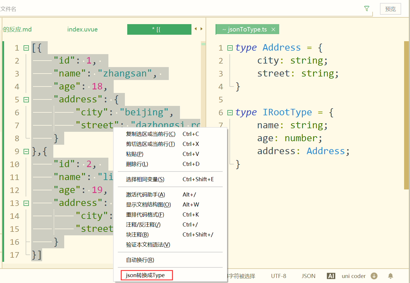 与UTSJSONObject方式相比,type方式在使用数据时可以使用.操作符,有代码提示。虽然需要定义type,但也有工具可以自动生成type。