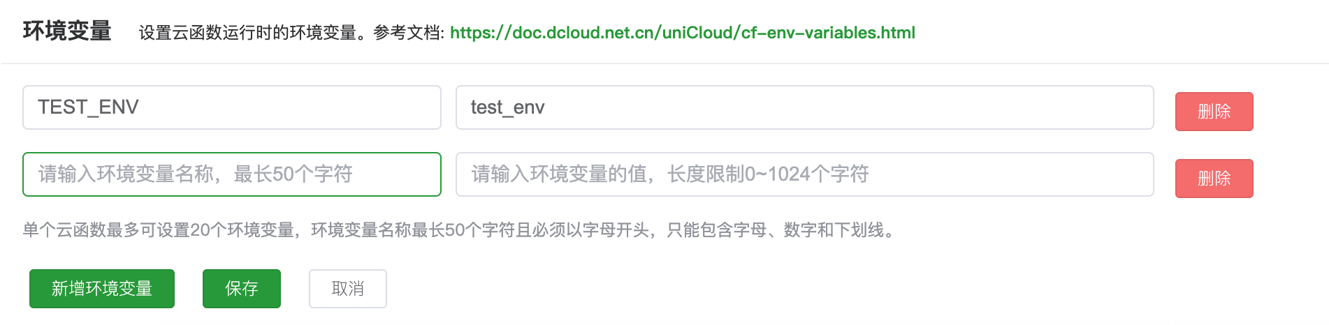 - 预留的环境变量 key 前缀无法配置,前缀包括:SCF_、QCLOUD_、TENCENTCLOUD_、UNI_、 UNICLOUD_、 DCLOUD_、WORKSPACE_、TCB_、RUNTIME_、TRIGGER_