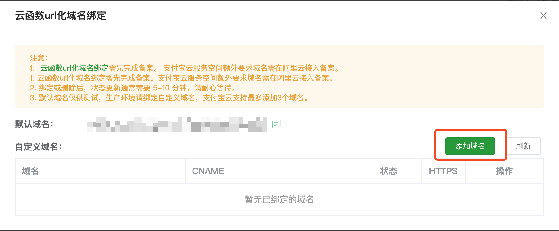 其中CNAME的值腾讯云需要绑定成功后才能获取到,获取到之后将绑定域名的CNAME解析配置为该记录值。阿里云及支付宝云绑定前便可以获取到CNAME,需先配置解析然后操作绑定。