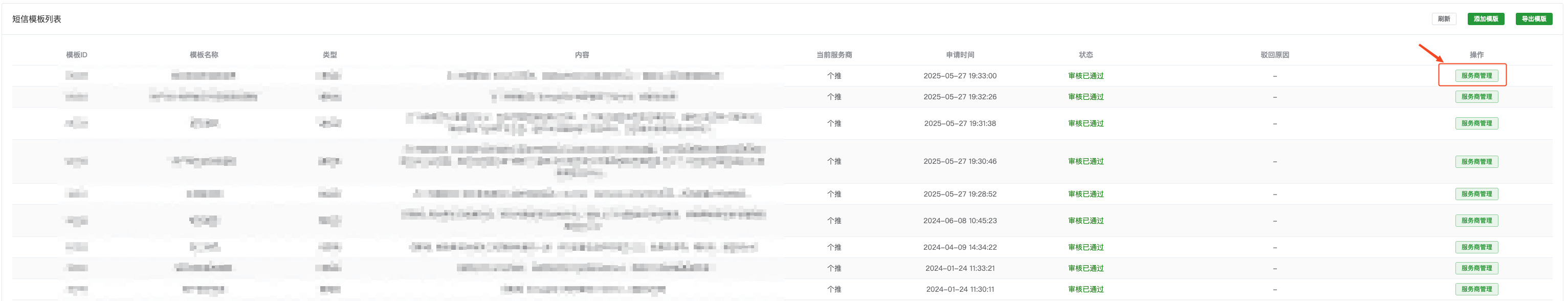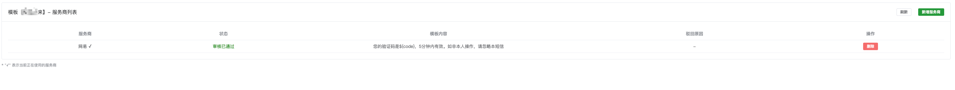 列表中带"✓"标记的为当前正在使用的服务商。模板当前使用的服务商由签名的当前服务商决定,如需切换请前往对应签名的服务商管理页面操作。