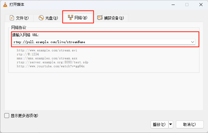 - 在网络URL输入框中,输入您的拉流地址,例如:
